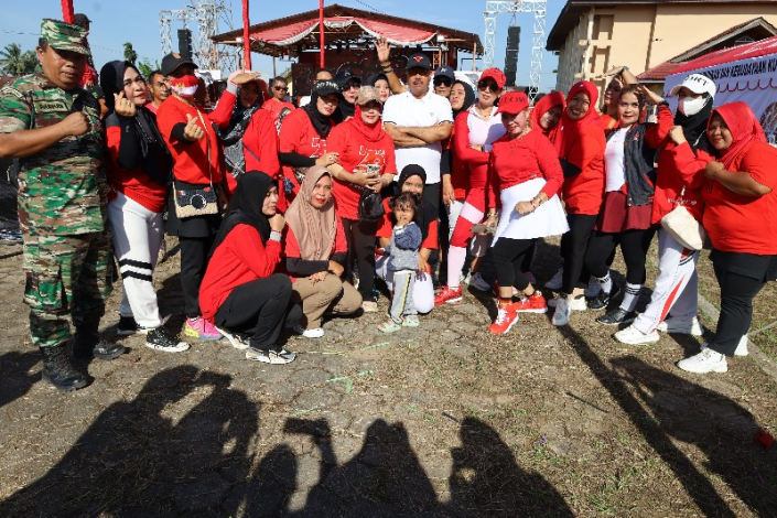 Edi Damansyah bersama ribuan warga Sanga-Sanga bersemangat mengikuti senam Merah Putih yang dipandu oleh Staf Dispora Kukar.